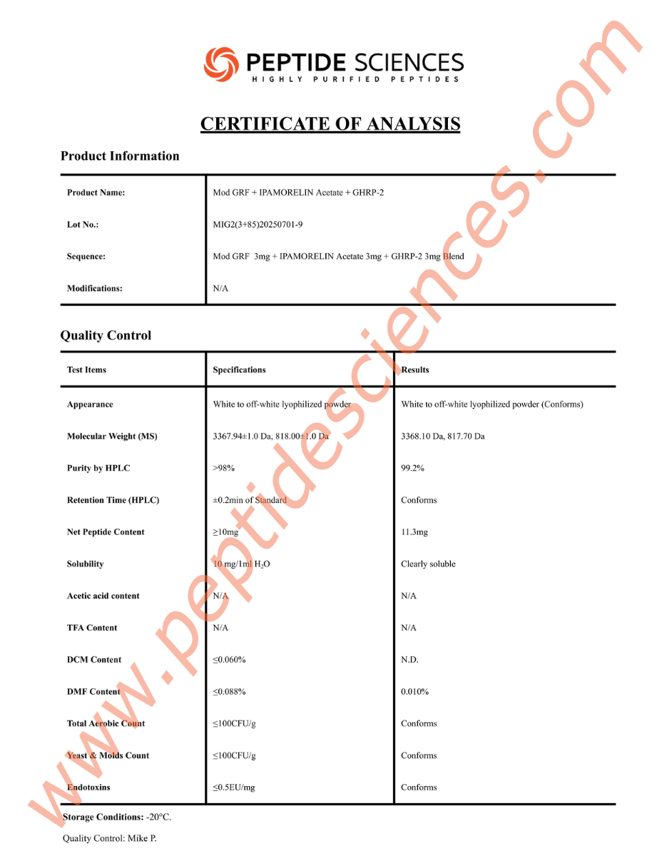 Note: The Mod GRF / Ipamorelin / GHRP-2 Blend is provided for Laboratory Research Use Only. It is not intended for human or animal consumption. Please ensure all safety and handling protocols are strictly followed in your facility.