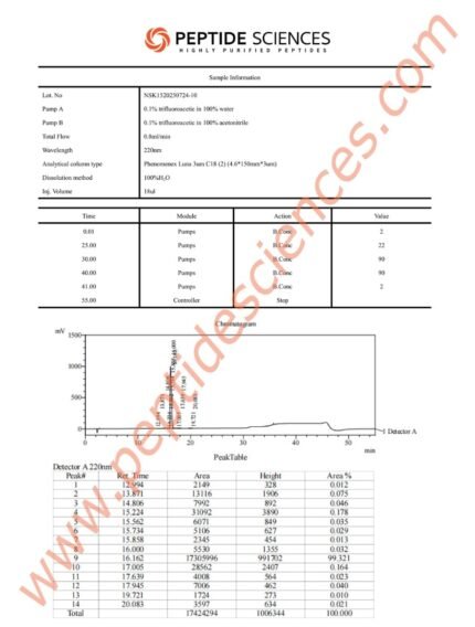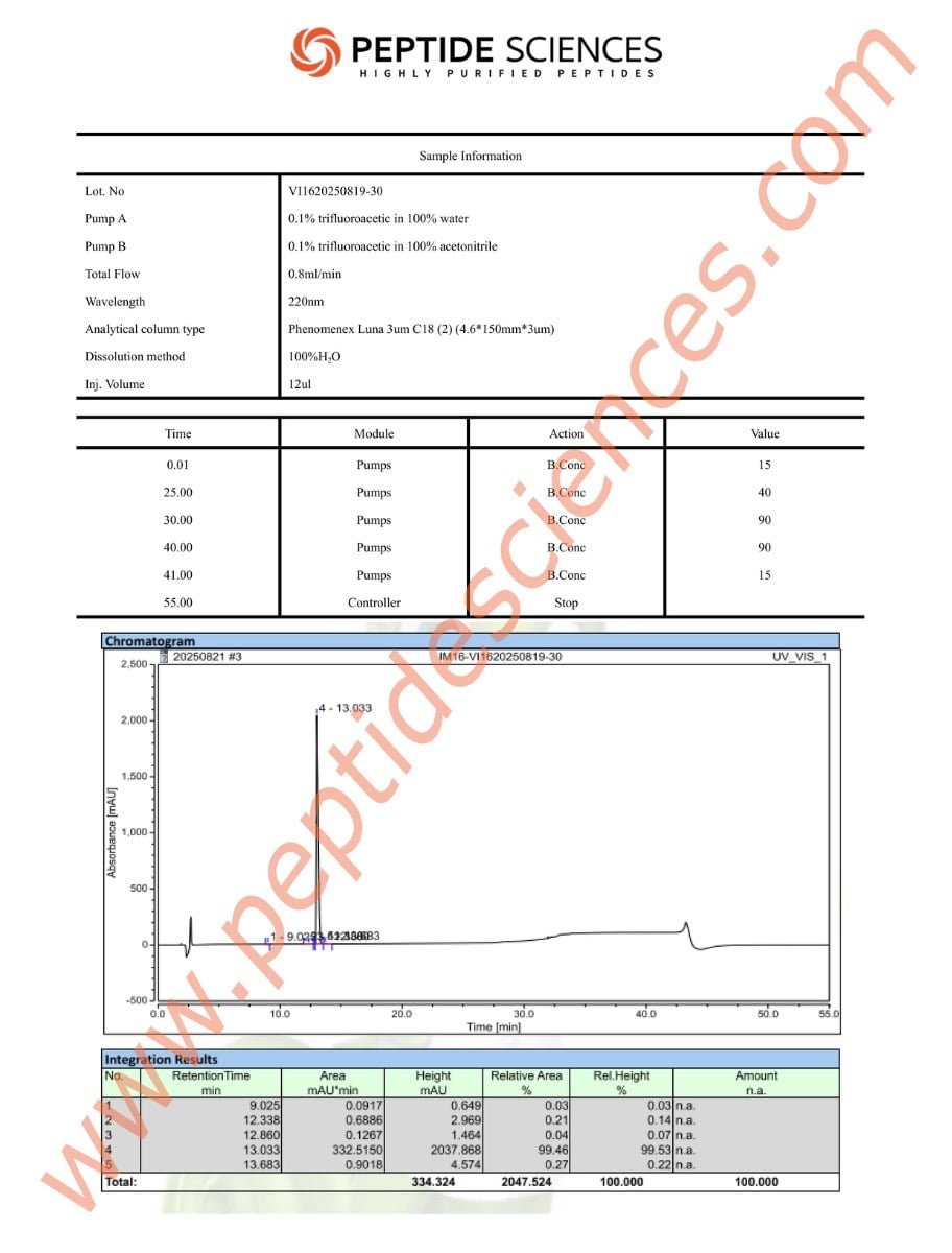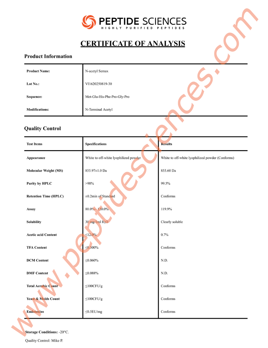 Verified 99%+ Purity: Every 30mg vial of N-Acetyl Semax Amidate is tested via HPLC-MS to ensure industry-leading purity and sequence accuracy.